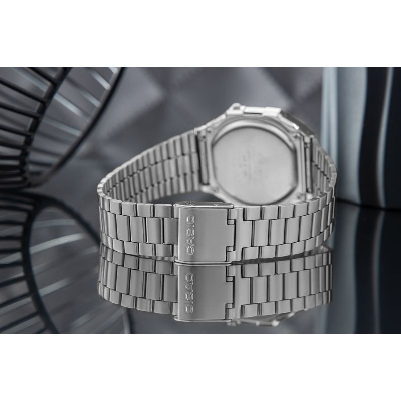 Gefertigt aus hochwertigem Edelstahl , garantiert sie Langlebigkeit und ganztägigen Tragekomfort. Ihr klassisches Design harmoniert perfekt mit dem Vintage-Charme, während die dezente gebürstete Oberfläche der Uhr einen zeitlosen Charakter verleiht. Das Casio-Logo ist auf der Schließe eingeprägt.