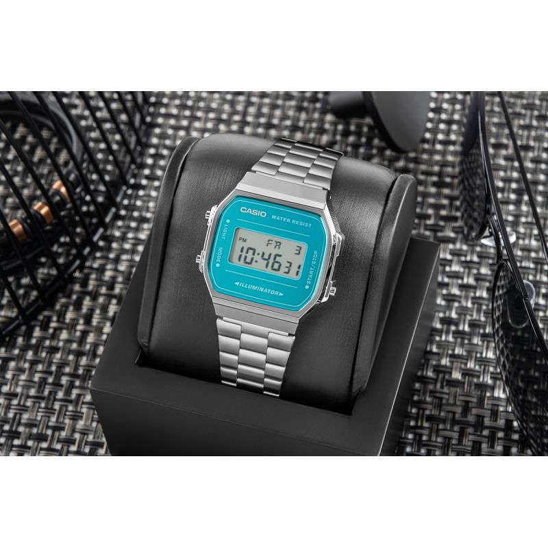 Nicht jede Uhr vereint klassischen Stil mit Charakter, doch diese schafft es mühelos. Die Casio A168WEM-2EF ist eine Rückkehr zu ihren Wurzeln in ihrer schönsten Form – schlicht, gut ablesbar, mit einem türkisfarbenen Zifferblatt in Spiegelglanz , das die Blicke auf sich zieht, ohne aufdringlich zu wirken. Das verchromte Gehäuse und das passende Stahlarmband bilden ein harmonisches Ganzes – schlicht, elegant und unaufdringlich. Diese Uhr braucht keine Trends. Sie hat ihre eigenen längst gesetzt. Das Modell verfügt über die Standard-Digitalanzeige: Stunde, Minute, Sekunde, Uhrzeit (PM), Datum und Wochentag. Und wenn es darauf ankommt, hat sie alles, was Sie brauchen. Eine Stoppuhr mit 1/100-Sekunden-Messung , eine Zwischenzeitfunktion, ein Tagesalarm und ein Stundensignal – praktische Funktionen in einem eleganten Design. Am Abend, wenn das Licht schwindet, genügt ein einziger Knopfdruck – die elektrolumineszierende blaugrüne Hintergrundbeleuchtung erhellt das Zifferblatt und verleiht ihm eine einzigartige Atmosphäre. Das Modell ist außerdem spritzwassergeschützt – denn das Leben fragt nicht, ob Sie einen Regenschirm dabei haben.