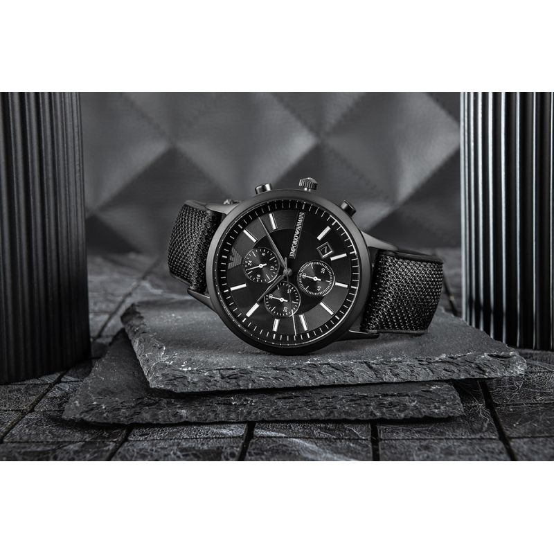 Die Emporio Armani Renato AR11457 Herrenuhr ist eine elegante Uhr, die klassisches Design mit modernem Charakter vereint. Das 43-mm-Gehäuse aus schwarzem Edelstahl garantiert Langlebigkeit und zeitlose Eleganz. Ein schwarzes Zifferblatt mit dezentem Glanz unterstreicht den stilvollen Charakter des Modells, während weiße Indizes und schwarze Zeiger für einen makellosen Look sorgen. Die Uhr verfügt über eine Chronographenfunktion und eine Datumsanzeige zwischen 4 und 5 Uhr und ist somit ideal für den Alltag. Ein zuverlässiges Quarzwerk gewährleistet präzise Zeitmessung, und das robuste Mineralglas schützt die Uhr. Das Armband mit Textilstruktur harmoniert perfekt mit dem Gehäuse und sorgt für einen stimmigen und eleganten Look, der sowohl zum Anzug als auch zum Alltag passt. Die Emporio Armani Renato Chrono AR11457 ist ein Modell für Männer, die Wert auf klassischen Stil, Qualität und das Prestige italienischer Handwerkskunst legen.