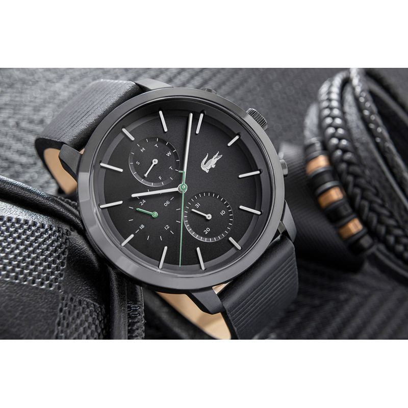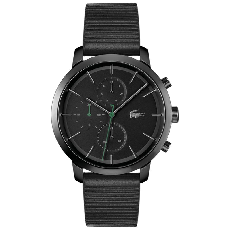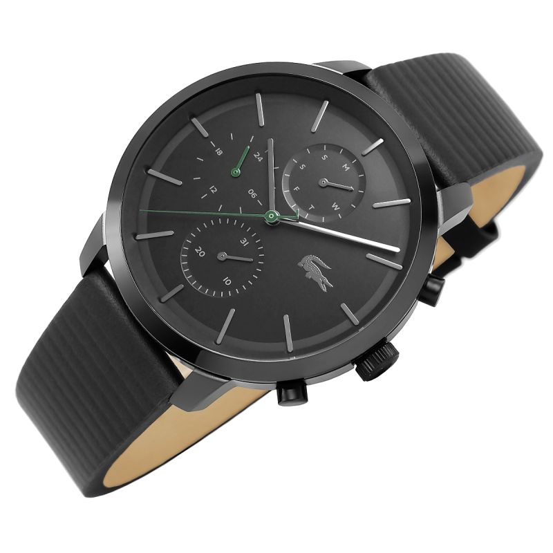 Die Uhr ist komplett in tiefem, mattem Schwarz gehalten und besticht durch ihren markanten, kraftvollen Look. Dezente grüne Akzente auf den Zeigern verleihen ihr Dynamik und greifen das klassische Lacoste-Logo auf. Gefertigt aus robusten Materialien, verfügt die Uhr über ein Edelstahlgehäuse, das für Langlebigkeit und Eleganz sorgt. Das strukturierte schwarze Echtlederarmband unterstreicht den sportlich-eleganten Charakter dieses Modells und garantiert ganztägigen Tragekomfort. Das schwarze Lacoste-Logo, das stolz auf Zifferblatt und Schließe prangt, ist ein Zeichen von Prestige und zeitloser Qualität.