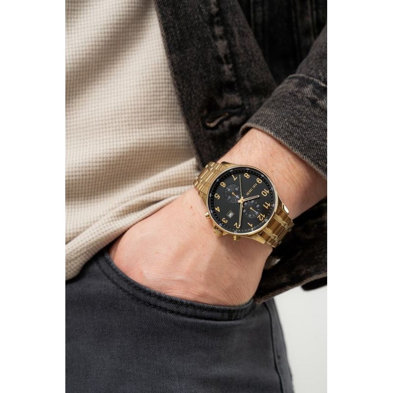 Gefertigt aus hochwertigstem Edelstahl, vereint diese Uhr außergewöhnliche Langlebigkeit mit einem luxuriösen Finish, das auf den ersten Blick beeindruckt. Ihre robuste Konstruktion garantiert Zuverlässigkeit und sorgt für perfekten Tragekomfort, egal wie anspruchsvoll Ihr Tag auch sein mag. Die präzise gefertigte, mit dem Logo geprägte Schließe unterstreicht den kraftvollen, maskulinen Charakter und verleiht der Uhr einen Hauch von Eleganz und Prestige. Ein mehrstufiger Schließmechanismus verhindert versehentliches Öffnen.