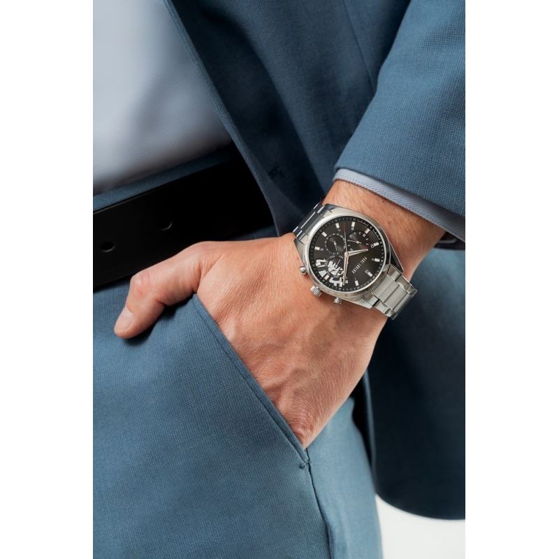 Gefertigt aus hochwertigstem Edelstahl, vereint diese Uhr außergewöhnliche Langlebigkeit mit einem luxuriösen Finish, das auf den ersten Blick beeindruckt. Ihre robuste Konstruktion garantiert Zuverlässigkeit und sorgt für perfekten Tragekomfort, egal wie anspruchsvoll Ihr Tag auch sein mag. Die präzise gefertigte, mit dem Logo geprägte Schließe unterstreicht den kraftvollen, maskulinen Charakter und verleiht der Uhr einen Hauch von Eleganz und Prestige. Ein mehrstufiger Schließmechanismus verhindert versehentliches Öffnen.