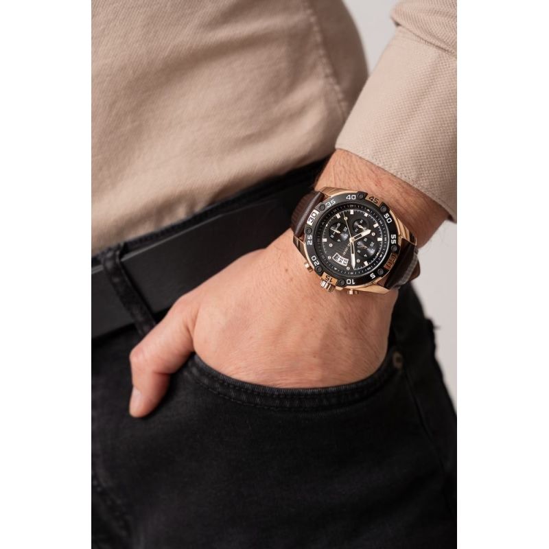 Die Chronographen dieser Uhr sind ein wahres Meisterwerk, das jeden Mann begeistern wird, der Wert auf präzise Zeitmessung legt. Intuitive Bedienung und hervorragende Ablesbarkeit machen die Nutzung der Chronographen zu einem wahren Vergnügen. Die eleganten Anzeigen für 24 Stunden, zweite Zeitzone und Wochentag bilden eine harmonische Komposition und verleihen jedem Männerhandgelenk eine besondere Eleganz. Zusätzlich verfügt die Uhr über eine Datumsanzeige. Die durchdachten Funktionen dieses Modells machen sie zu einem unverzichtbaren Begleiter im Alltag und unterstreichen perfekt den Stil des Mannes, der Ordnung und Präzision schätzt.
