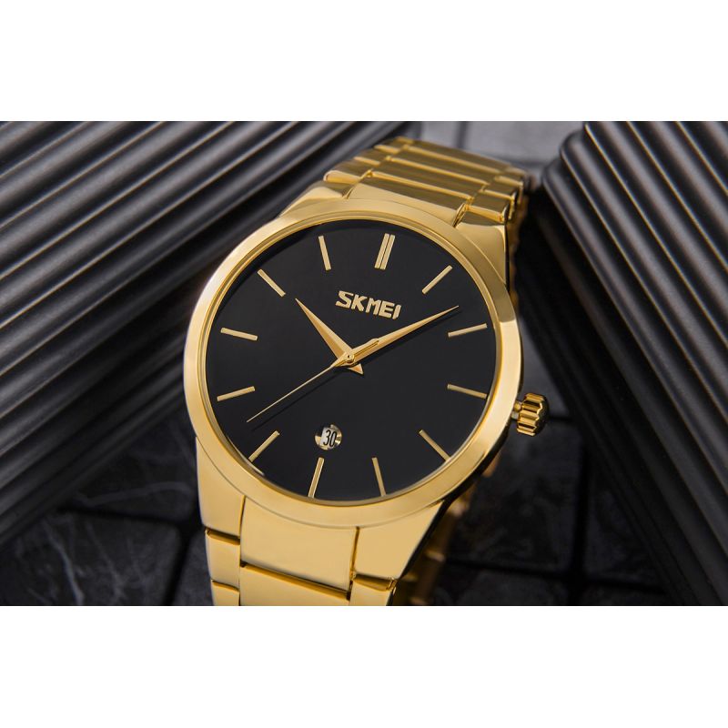 Die SKMEI 9140 ist eine Uhr, die in keiner Sammlung eines Mannes fehlen sollte, der Wert auf Schlichtheit und Klasse legt. Das minimalistische Zifferblatt mit Datumsanzeige, mit höchster Präzision gefertigt, harmoniert perfekt mit den dezenten Indizes und Zeigern und schafft so eine elegante und zugleich ausdrucksstarke Komposition. Wenn Sie eine Uhr suchen, die sowohl zum Anzug als auch zur Freizeit passt, ist dieses Modell eine sichere Wahl.