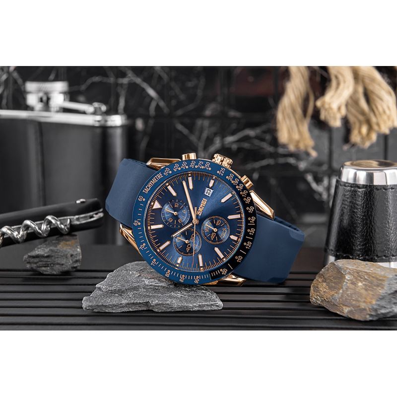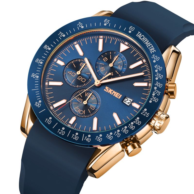Die Skmei 9253 mit Silikonarmband besticht durch ein Farbschema, das von exklusiven Premium-Uhren inspiriert ist und ihr einen einzigartigen, dynamischen Charakter verleiht. Das kupferfarbene Gehäuse bildet einen Kontrast zur tiefblauen, markanten Lünette und dem Zifferblatt und kreiert so einen luxuriösen, sportlichen Look, der den Stil führender internationaler Marken widerspiegelt. Das Silikonarmband bietet zusätzlichen Tragekomfort und ist angenehm leicht – die perfekte Kombination aus Eleganz und Funktionalität für jeden Anlass.