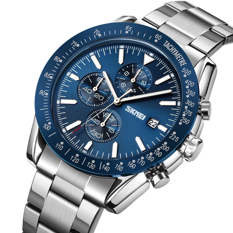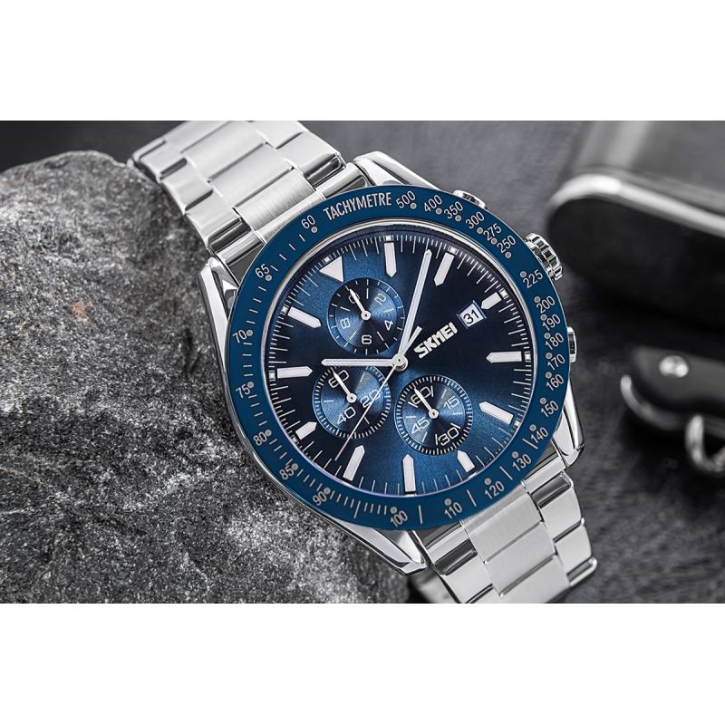 Die Skmei 9253 besticht durch ein von exklusiven Premium-Uhren inspiriertes Farbschema, das ihr einen einzigartigen Charakter verleiht. Das silberne Gehäuse und Armband strahlen Luxus und Eleganz aus und bilden einen perfekten Kontrast zur marineblauen Lünette und dem Zifferblatt – ein Merkmal der besten Designs internationaler Marken. Silberne Indizes und Zeiger mit Leuchtbeschichtung unterstreichen nicht nur den luxuriösen Stil der Uhr, sondern gewährleisten auch optimale Ablesbarkeit bei allen Lichtverhältnissen. Der rote Akzent am Sekundenzeiger verleiht ihr eine sportliche Note und verbindet Eleganz mit Dynamik.
