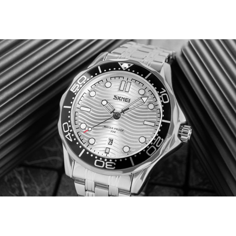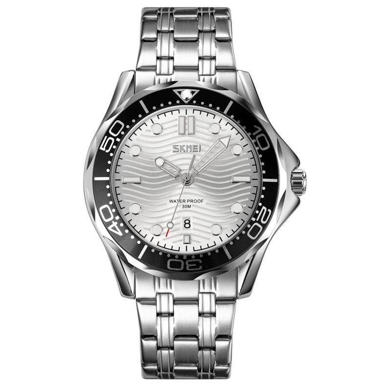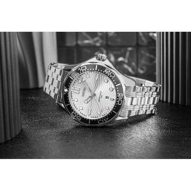Jetzt können Sie dieses luxuriöse Design am Handgelenk tragen. Das Modell Skmei 9276 erinnert stark an die Omega Seamaster-Linie, insbesondere durch die ähnliche Gehäuseform, das wellenförmige Zifferblattmuster und die gut ablesbare Lünette. Es ist eine hervorragende Wahl für alle, die eine elegante und erschwingliche Uhr suchen, deren Look von renommierten Zeitmessern inspiriert ist.