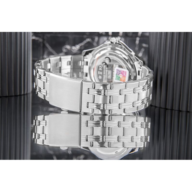Das in dieser Uhr verwendete Glas besteht aus Silikat-Mineralglas, das härter als synthetisches Glas ist. Dadurch wird das Zifferblatt wirksam vor Kratzern, Beschädigungen und Schmutz geschützt. Mineralglas ist zudem flexibel und daher weniger anfällig für Risse und Brüche. Es bietet außerdem hervorragende Klarheit und Helligkeit, was das schnelle und klare Ablesen der Uhrzeit bei unterschiedlichen Lichtverhältnissen deutlich erleichtert.