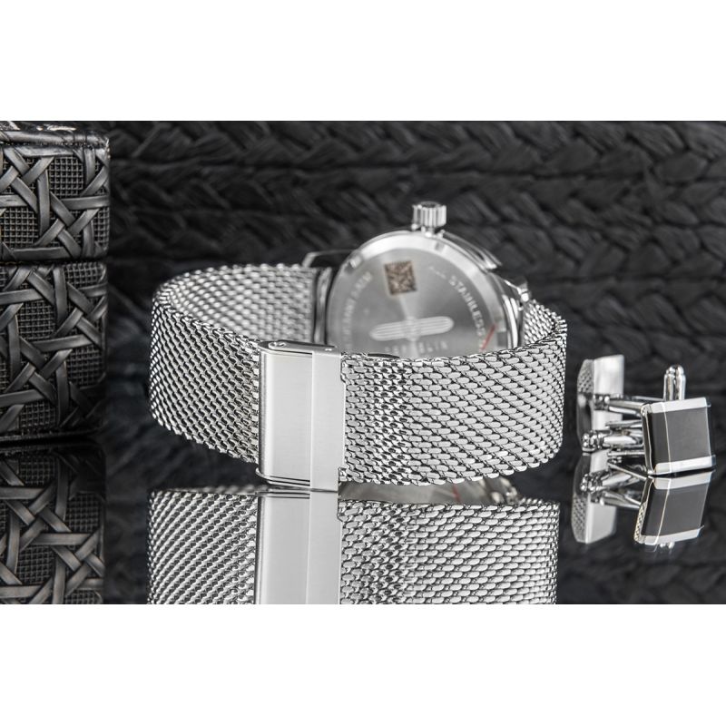 Das glänzende und massive Silbergehäuse bildet die Grundlage des gesamten Designs und besticht durch seine schlichte und zeitlose Form. Das edle, warme und dezente Beige des Zifferblatts erinnert an die Innenräume historischer Luftschiffe und fängt die Atmosphäre der Ära der großen Seereisen ein. Kräftige schwarze Ziffern und Indizes bilden einen perfekten Kontrast zum Zifferblatthintergrund und gewährleisten hervorragende Ablesbarkeit bei gleichzeitig klassischer Eleganz. Zeiger in Silber- und Schwarztönen setzen einen markanten Akzent, während der präzise Sekundenzeiger mit dezentem Rot die Aufmerksamkeit auf sich zieht und die Funktionalität der Uhr unterstreicht. Das robuste Edelstahl-Mesh-Armband rundet das Design ab und bietet Leichtigkeit, Tragekomfort und einen vom Fliegerstil inspirierten Look, der die Einzigartigkeit dieses Modells hervorhebt.
