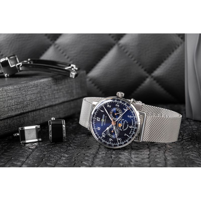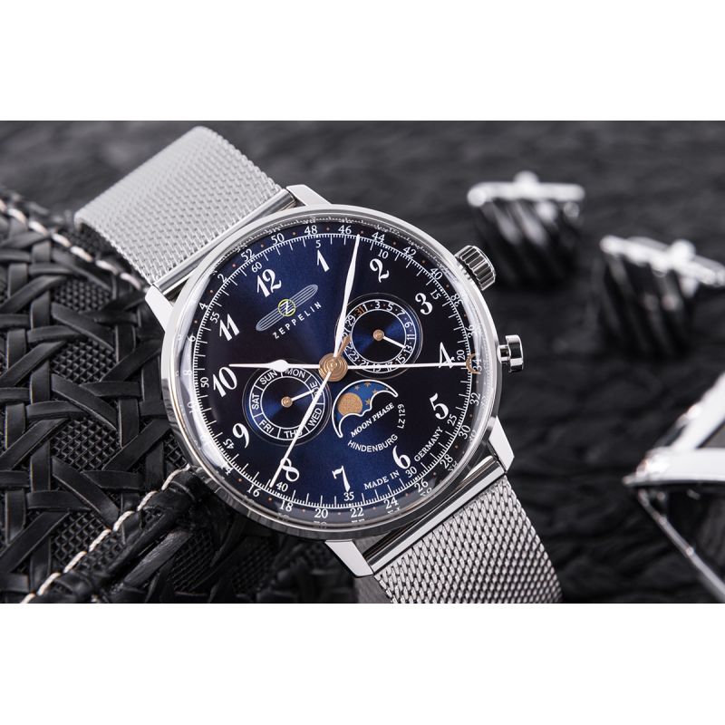 Mit einer Zeppelin-Uhr entscheiden Sie sich für mehr als nur einen Zeitmesser – Sie erwerben Geschichte in elegantem Design, Präzision bis ins kleinste Detail und zeitlosen Luxus, der Sie viele Jahre begleiten wird. Die Zeppelin 7036M-3 ist eine Hommage an vergangene Zeiten. Ihr metallisch-blaues Zifferblatt und die kontrastierenden, schneeweißen Details erinnern an große Luftfahrtexpeditionen. Dank Funktionen wie Mondphasenanzeige, Kalender und Wochentagsanzeige ist dieses Modell nicht nur ein Symbol zeitlosen Stils, sondern auch ein praktischer Begleiter im Alltag.