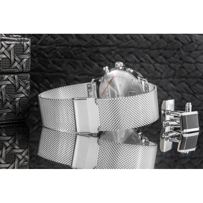 Das Milanaise-Armband des Zeppelin-Modells vereint Komfort und Langlebigkeit und erfüllt damit die Ansprüche des modernen Mannes. Gefertigt aus hochwertigem Edelstahl, garantiert es Langlebigkeit, Korrosionsbeständigkeit und einen eleganten Glanz, der perfekt zum silbernen Gehäuse der Uhr passt. Seine feine Flechtstruktur schmiegt sich optimal ans Handgelenk an und sorgt für Atmungsaktivität und hohen Tragekomfort den ganzen Tag. Der dezente Schimmer harmoniert perfekt mit dem silbernen Gehäuse und verleiht der Uhr einen luxuriösen und zeitlosen Look.