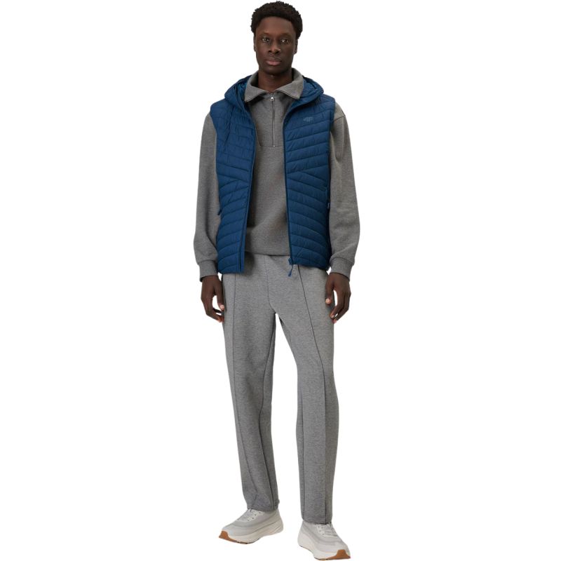 4F M344 Herrenweste Marineblau 4FWSS26TVJAM344 31S Eine Herrenweste für die Übergangszeit mit wasserabweisender Beschichtung und synthetischer Isolierung für angenehme Wärme ohne zu beschweren. Die normale Passform sorgt für hohen Tragekomfort, und die Kapuze schützt vor Wind. Drei Reißverschlusstaschen und ein durchgehender Reißverschluss erhöhen die Funktionalität im Alltag. Technische Daten: Hauptmaterial: 100 % Polyester, Futter: 100 % Polyester, Füllung: 100 % Polyester. Wasserabweisende Imprägnierung – schützt das Material vor Nässe und unerwartetem Regen. Leichte Polyesterisolierung – bietet optimale Wärme ohne zu beschweren und ist pflegeleicht. Fischgrät- und horizontale Steppung – kombiniert modisches Design mit gleichmäßiger Wärmeverteilung. Integrierte, nicht verstellbare Kapuze – schützt vor Wind und leichtem Regen. Einseitiger Hauptreißverschluss – ermöglicht einfaches An- und Ausziehen. Zwei seitliche Reißverschlusstaschen und eine Innentasche mit Reißverschluss – bieten sicheren Stauraum für Kleinigkeiten. Normale Passform – liegt bequem am Körper an und schränkt die Bewegungsfreiheit nicht ein.