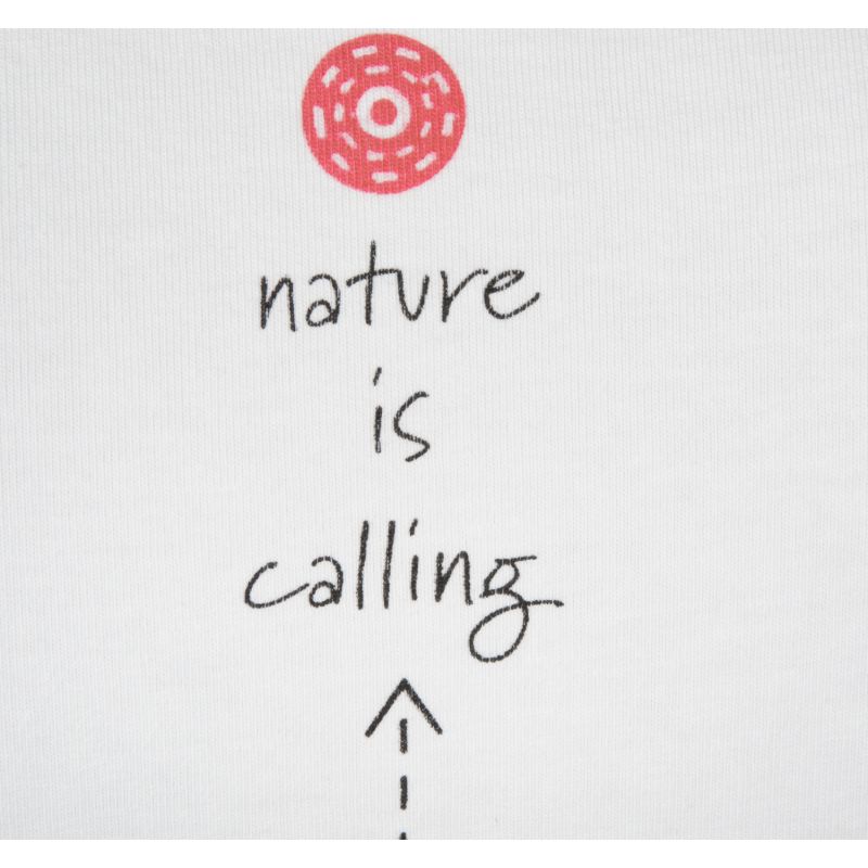 - auf der Rückseite unter dem Nacken wiederholt sich die Aufschrift „Nature is calling“