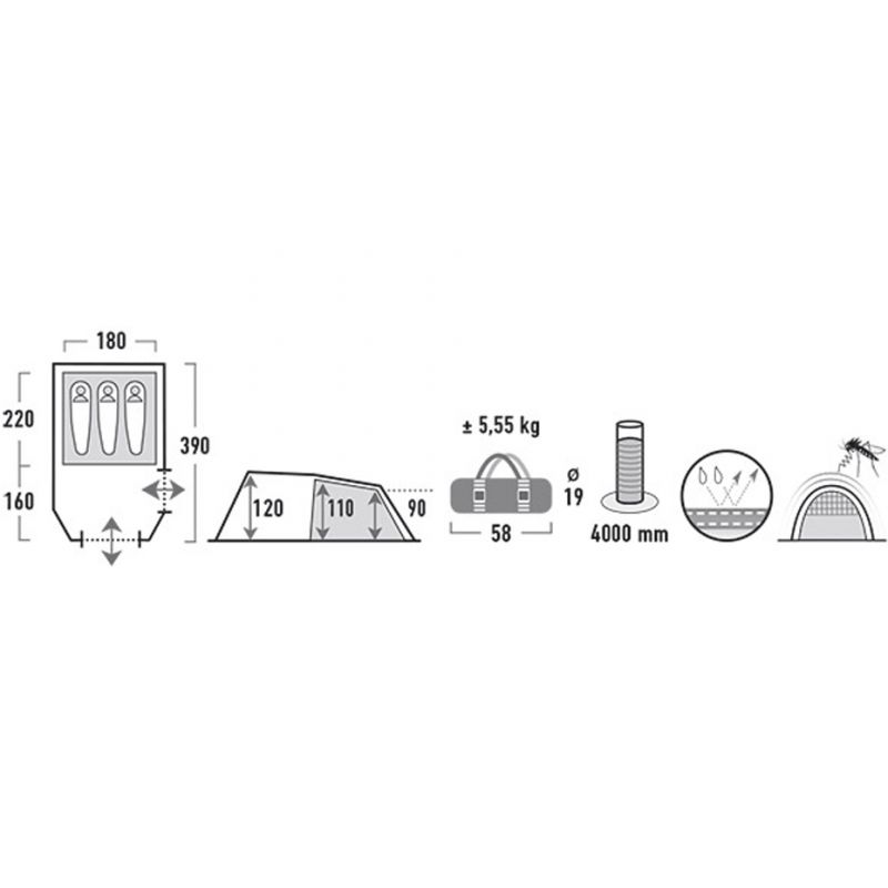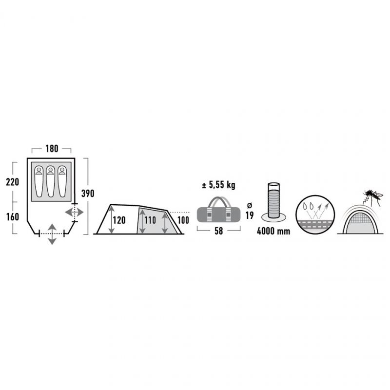 - Laminierte Nähte und eine Wassersäule von 4000 mm bieten hervorragenden Schutz vor Regen. Belüftungslöcher sorgen für eine konstante Luftzirkulation. Spezifikationen: Für 3 Personen, Wassersäule: 4000 mm