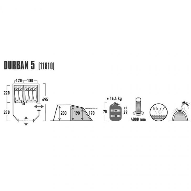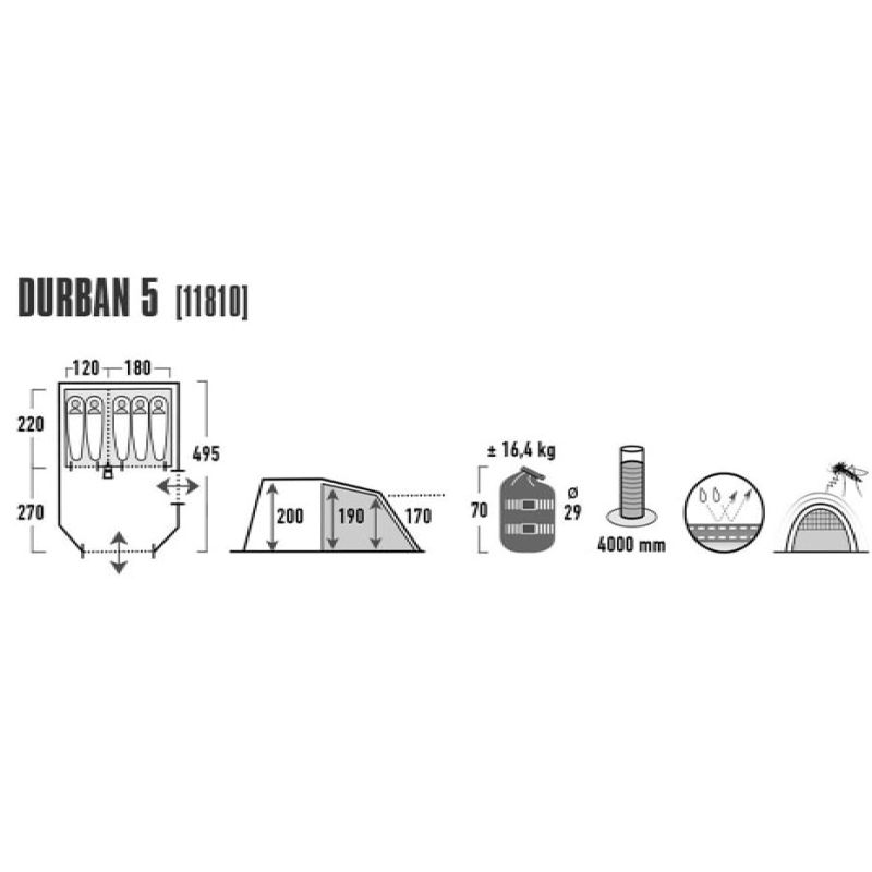 - Außenzelt: 100 % Polyester, PU, versiegelte Nähte