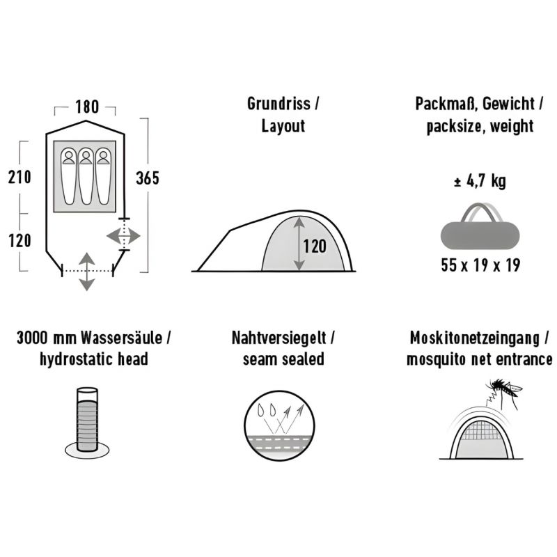 Material: Außenzelt 100 % Polyester Alu UV Protect 80, verschweißte Nähte, Schlafkabine 100 % atmungsaktives Polyester, Netztür, nicht abnehmbare Bodenplane 100 % Polyethylen (PE)