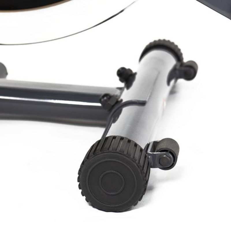 Ein weiterer Vorteil dieser Konstruktion sind die Stahlkufen mit komfortablen Anti-Rutsch-Füßen. Die an der Vorderseite montierten Transportrollen ermöglichen ein einfaches Verschieben des Geräts. Die höhenverstellbaren Handläufe sind mit einem weichen, ergonomischen Schwamm überzogen und sorgen so für noch mehr Komfort beim Training.