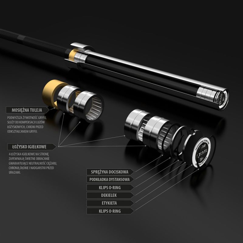 Die GCF700 HMS Olympiastange verfügt über acht Nadellager (vier auf jeder Seite), die eine reibungslose Rotation der Teile unter Last ermöglichen. Die Konstruktion verhindert Belastungen an den Rollenenden und verlängert so die Lagerlebensdauer. Trotz ihres geringen Querschnitts sind die Nadellager äußerst steif und belastbar.