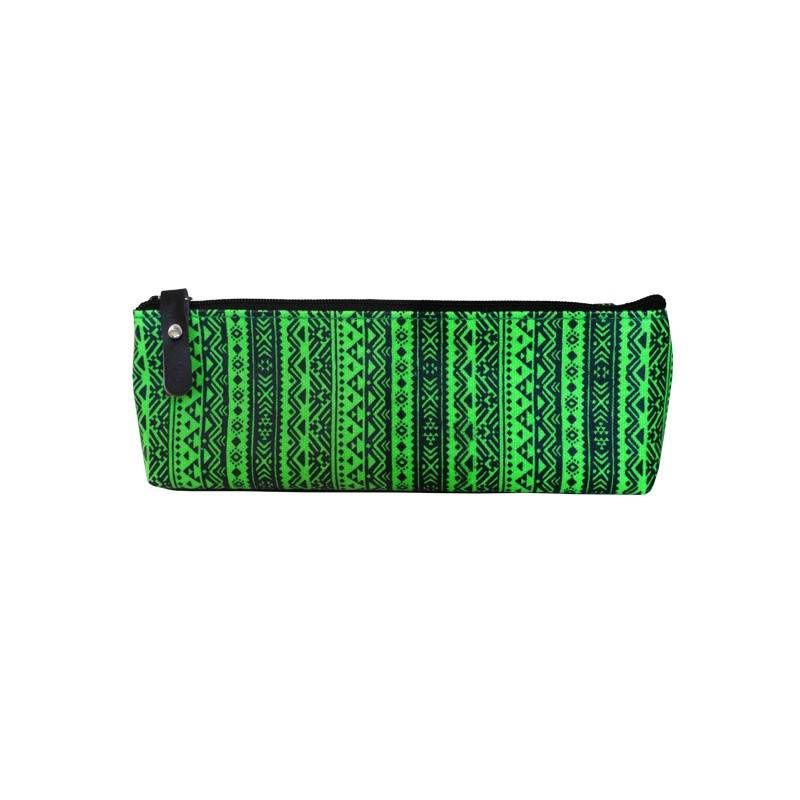 Grünes und schwarzes Federmäppchen mit Aztekenmuster.