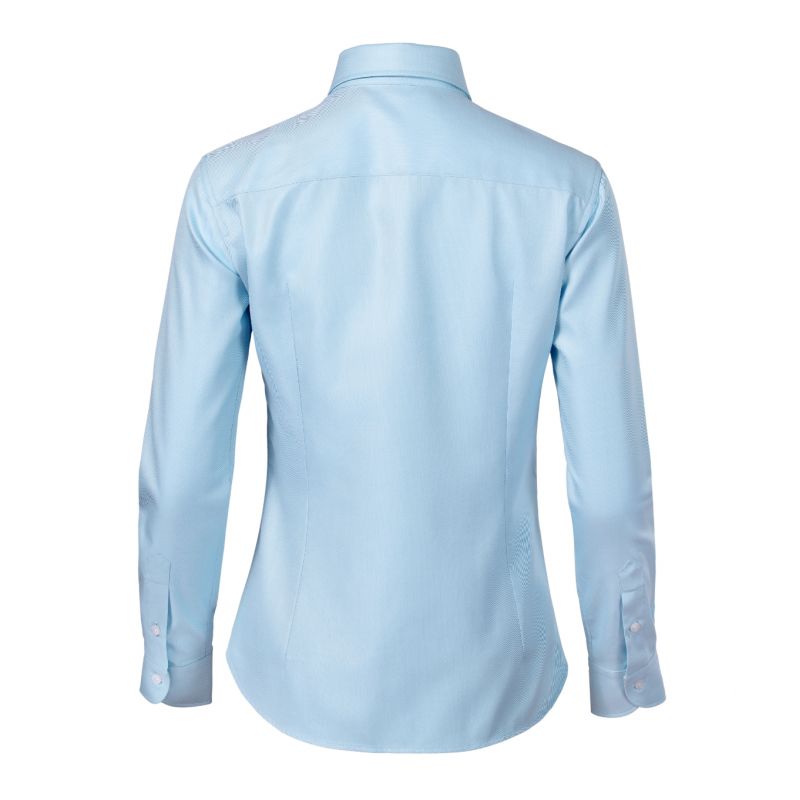 Micro Twill, 100 % Baumwolle, pflegeleicht, entworfen vom führenden tschechischen Schneider Roman Humlíček, extra langes Stapelgarn, taillierter Schnitt mit Seitennähten, doppelte Passe und Abnäher hinten, Abnäher in der Taille vorne, Hemdkragen, Vorderteile mit einer Falte abgeschlossen, lange Ärmel mit halbrunden Manschetten mit 2 Knöpfen, Perlmuttknöpfe in Farbe 00 (2 Ersatzknöpfe), abgerundeter unterer Saum