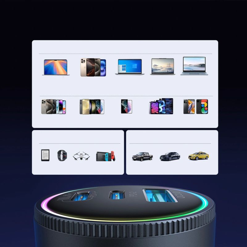 Der Joyroom JR-CCN07 ist ein fortschrittliches Autoladegerät mit einer Gesamtleistung von 145 W, mit dem Sie bis zu drei Geräte gleichzeitig schnell aufladen können. Ausgestattet mit zwei USB-C-Anschlüssen und einem USB-A-Anschluss unterstützt er die neuesten Schnellladeprotokolle PD 3.0, PPS, QC 4.0+, QC 3.0, AFC und FCP. Sein Metallgehäuse mit elegantem, dunkelgrauem Finish und das intelligente Wärmeableitungssystem sorgen nicht nur für ein stilvolles Erscheinungsbild, sondern auch für einen langen und sicheren Betrieb. Ein 100-W-USB-C-Kabel ist im Lieferumfang enthalten und eignet sich für die anspruchsvollsten Mobilgeräte und Laptops.