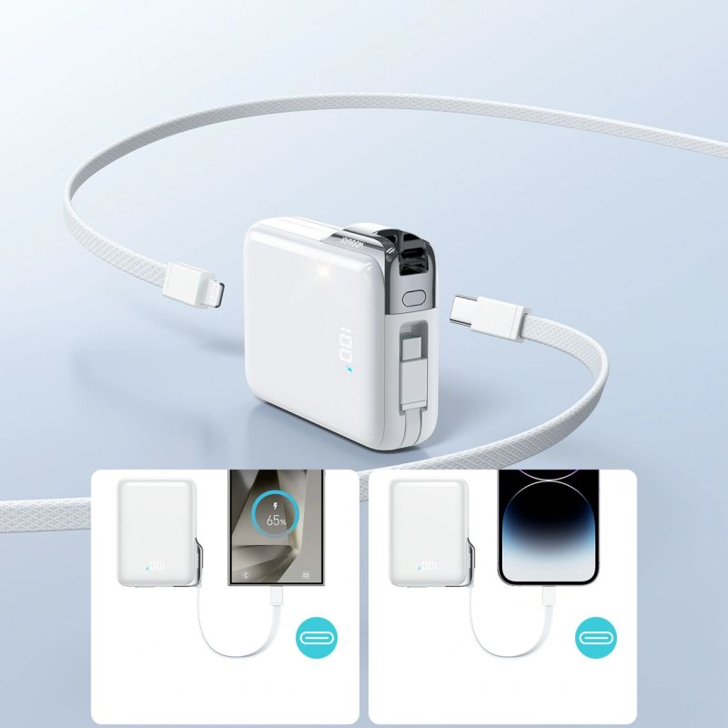 Joyroom JR-PBF27 Pro 10000mAh 30W Powerbank mit integriertem USB-C-Kabel und zusätzlichem bidirektionalem USB-C-auf Lightning Kabel – Weiß
