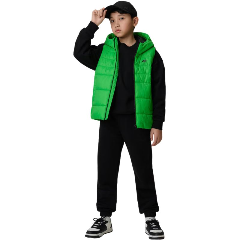 Jungenweste 4F M313 grün 4FJWSS26TVJAM313 41S Die Jungenweste 4F ist eine praktische Isolierschicht, die sich perfekt für den Alltag eignet. Technische Daten: Hauptmaterial: 100 % Polyamid, Futter: 100 % Polyester, Füllung: 100 % Polyester. 4FWarm-Technologie – sorgt für angenehmen Wärmekomfort. Hydrophobe Imprägnierung – reduziert die Wasseraufnahme und schützt vor Nässe. Leichte Synthetikisolierung – wärmt ohne zu beschweren und ist pflegeleicht. Symmetrische Steppung verteilt die Isolierung gleichmäßig und erhöht den Tragekomfort. Kapuze und Stehkragen – schützen vor Kälte und erhöhen den Komfort an windigen Tagen. Reißverschluss mit innenliegender Falte – hält die Wärme im Inneren. Zwei offene Taschen – bieten sicheren Platz für Kleinigkeiten. Normaler Schnitt – sitzt bequem am Körper und schränkt die Bewegungsfreiheit nicht ein.