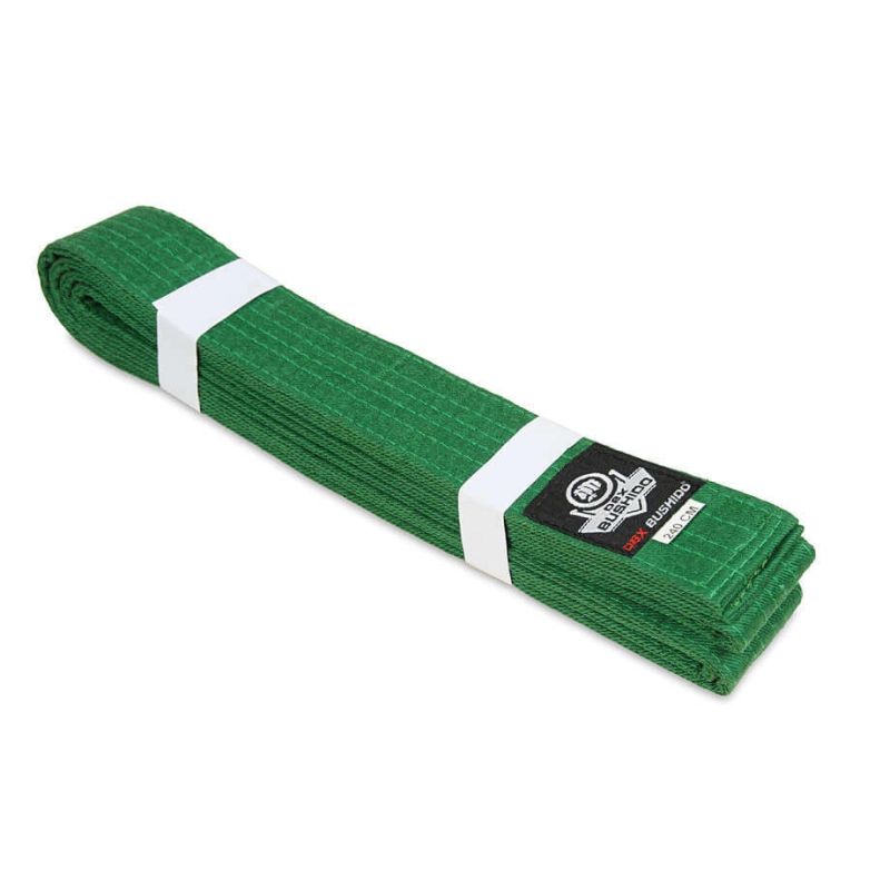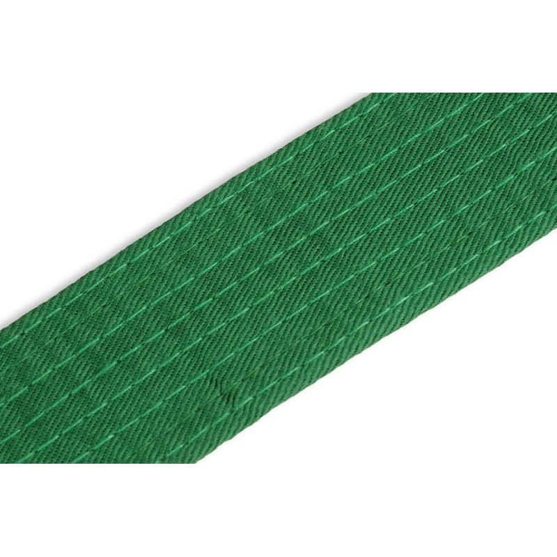 Ein grüner Gürtel für Kampfsport-Kimonos, hergestellt aus einer Materialmischung aus Polyester und Baumwolle, die für Abrieb- und Reißfestigkeit sorgt.
