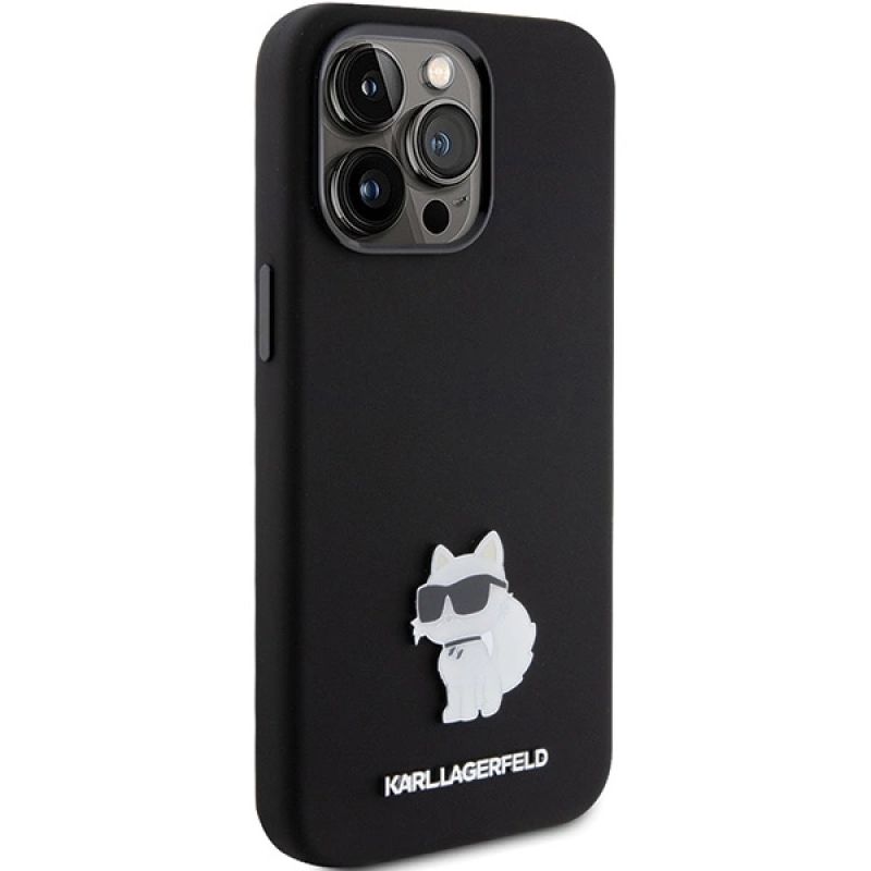 Karl Lagerfeld Choupette Metal Pin-Hülle aus Silikon für iPhone 15 Pro – Schwarz