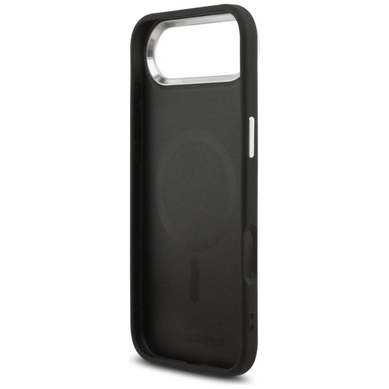 Die Rückseite ziert ein markanter Choupette-Pin aus Metall , der dem Accessoire eine einzigartige, modische Note verleiht. Ergänzt wird das Design durch eine Kameraeinfassung aus Aluminium und silberfarbene Seitenknöpfe , die den luxuriösen Charakter des Produkts unterstreichen. Der MagSafe-Ring trägt die Inschrift „KARL LAGERFELD“ und verleiht dem Accessoire zusätzliche Eleganz und außergewöhnlichen Stil.