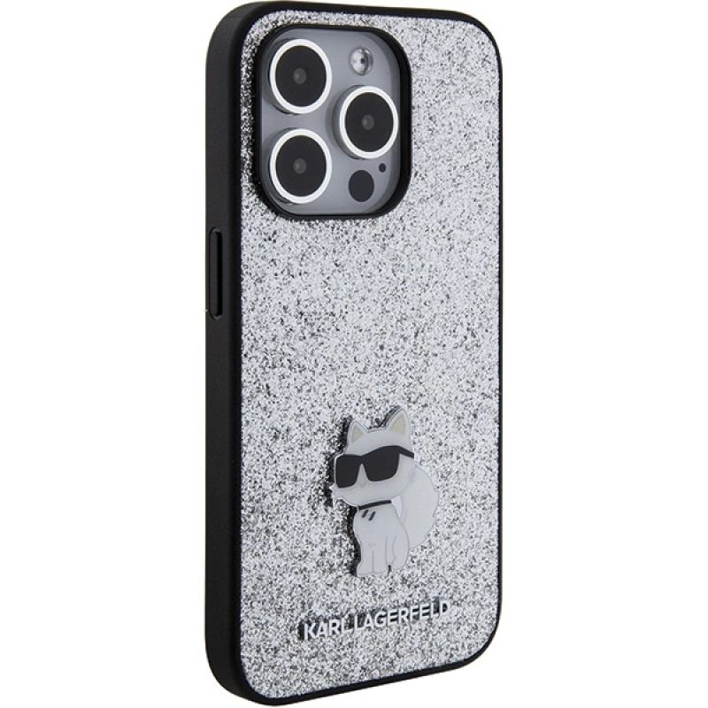 Karl Lagerfeld Feste Glitzer-Choupette-Logo-Metallnadelhülle für iPhone 15 Pro – Silber