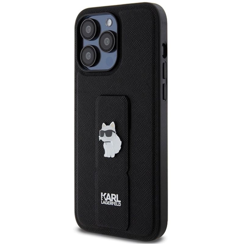 Karl Lagerfeld Gripstand Saffiano Choupette Pins Hülle für iPhone 13 Pro / 13 – Schwarz