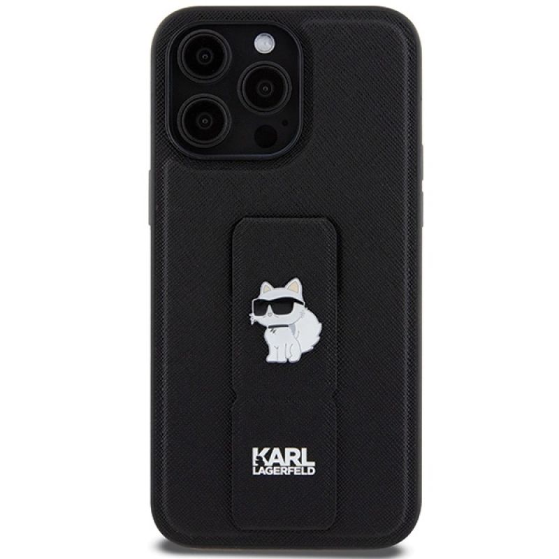 Karl Lagerfeld Gripstand Saffiano Choupette Pins Hülle für iPhone 13 Pro Max – Schwarz
