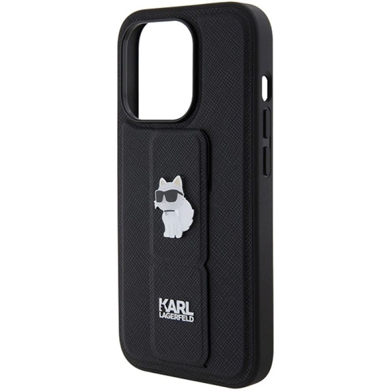 Karl Lagerfeld Gripstand Saffiano Choupette Pins Hülle für iPhone 14 Pro Max – Schwarz
