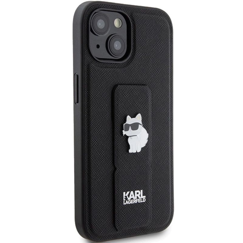 Karl Lagerfeld Gripstand Saffiano Choupette Pins Hülle für iPhone 15 Plus / 14 Plus – Schwarz