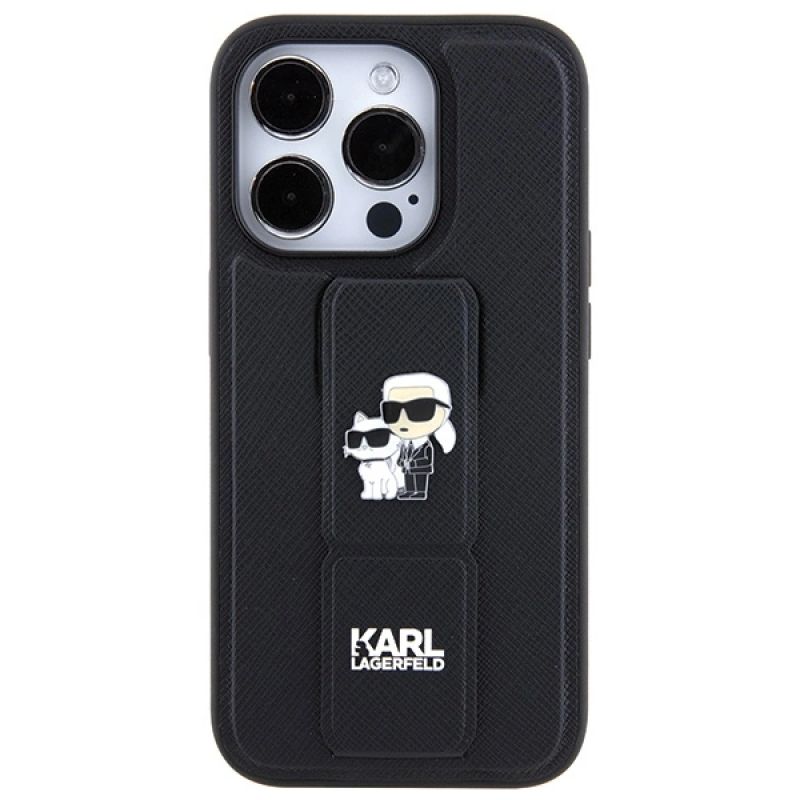 Karl Lagerfeld Gripstand Saffiano Karl&Choupette Pins Hülle für iPhone 13 Pro / 13 – Schwarz