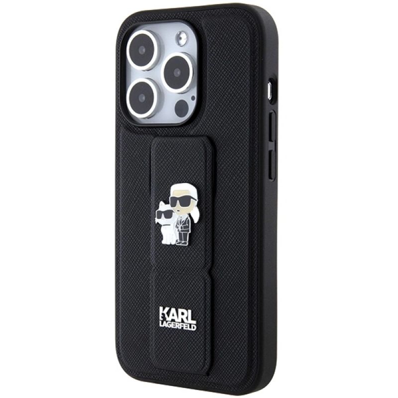 Karl Lagerfeld Gripstand Saffiano Karl&Choupette Pins Hülle für iPhone 14 Pro – Schwarz