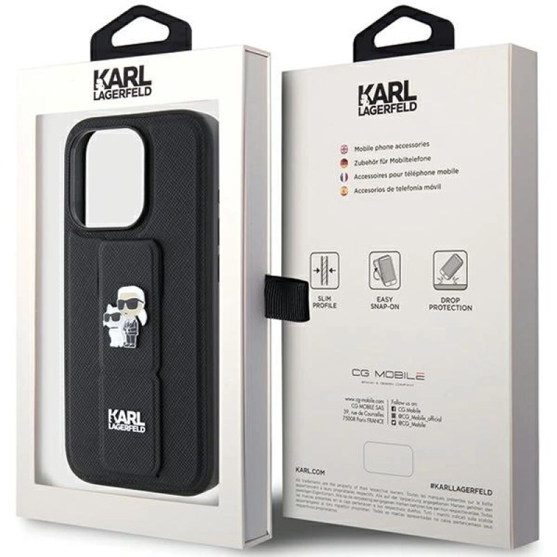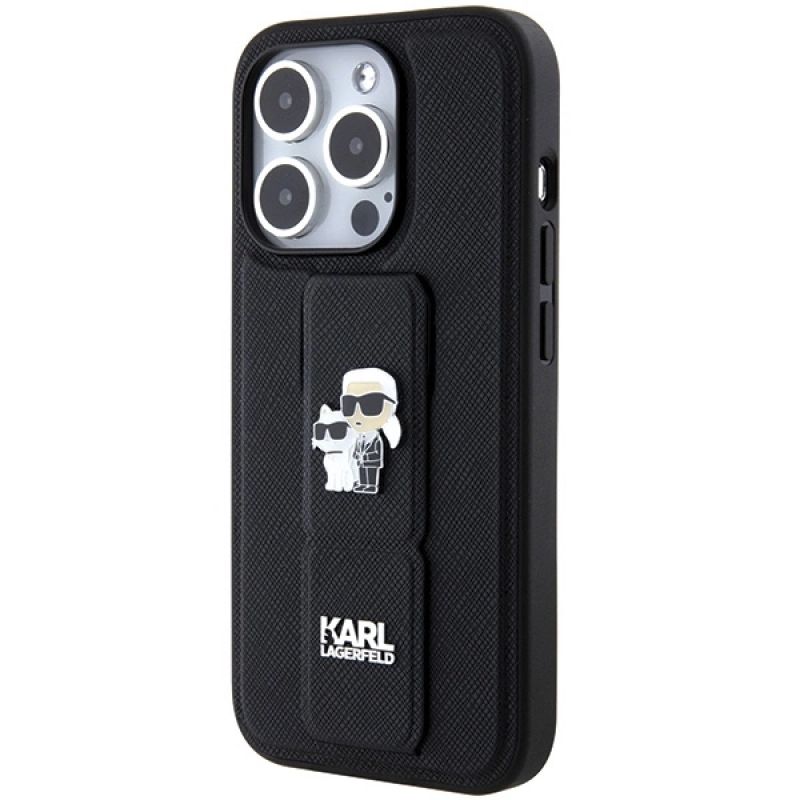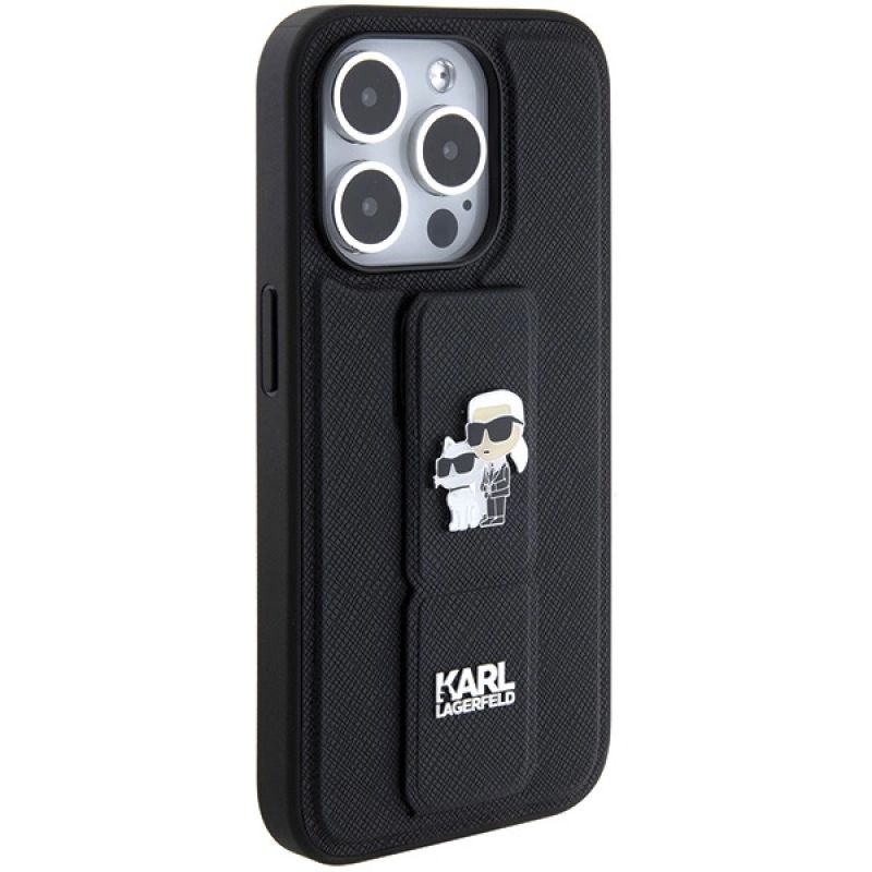 Karl Lagerfeld Gripstand Saffiano Karl&Choupette Pins Hülle für iPhone 15 Pro – Schwarz