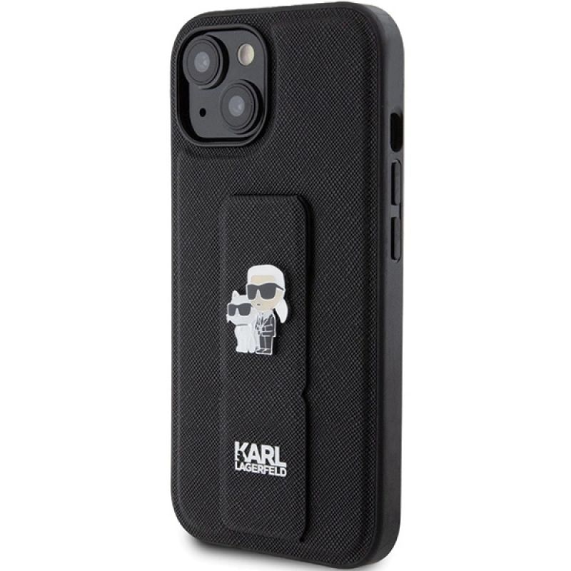 Karl Lagerfeld Gripstand Saffiano Karl&Choupette Pins Hülle für iPhone 15 – Schwarz