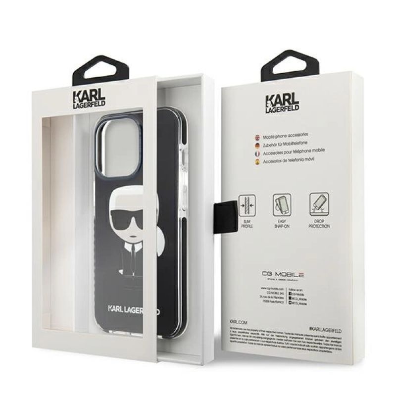 Sammlung Ikonik Karl Typ Hardcase Material TPU/PU Farbe Schwarz Kompatibilität iPhone 13 Pro / 13* 6,1"Bitte beachten Sie, dass beim iPhone 13 der Kameraausschnitt größer ausfällt und nicht reklamationsfähig ist.