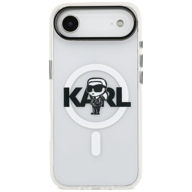 Die Rückseite ziert ein aufgedrucktes Karl Lagerfeld-Motiv mit großer KARL-Inschrift , ergänzt durch einen sichtbaren MagSafe-Ring .
