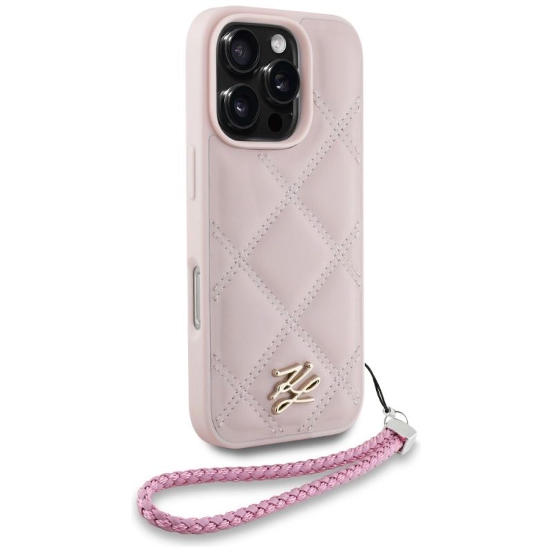Karl Lagerfeld iPhone 16 Pro Hülle mit gestepptem Initialen-Logo und Kettenriemen – Rosa