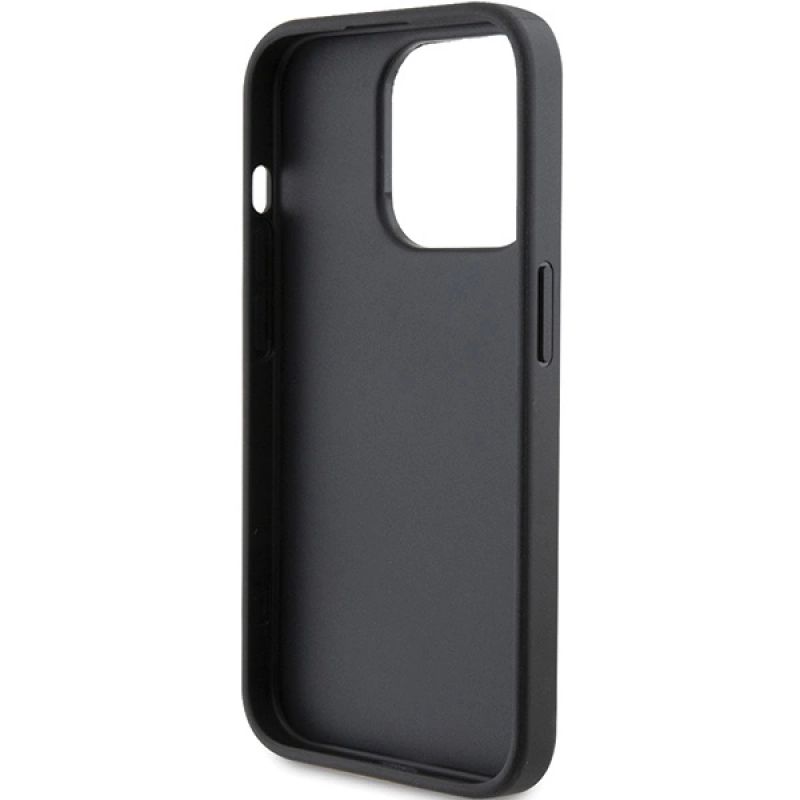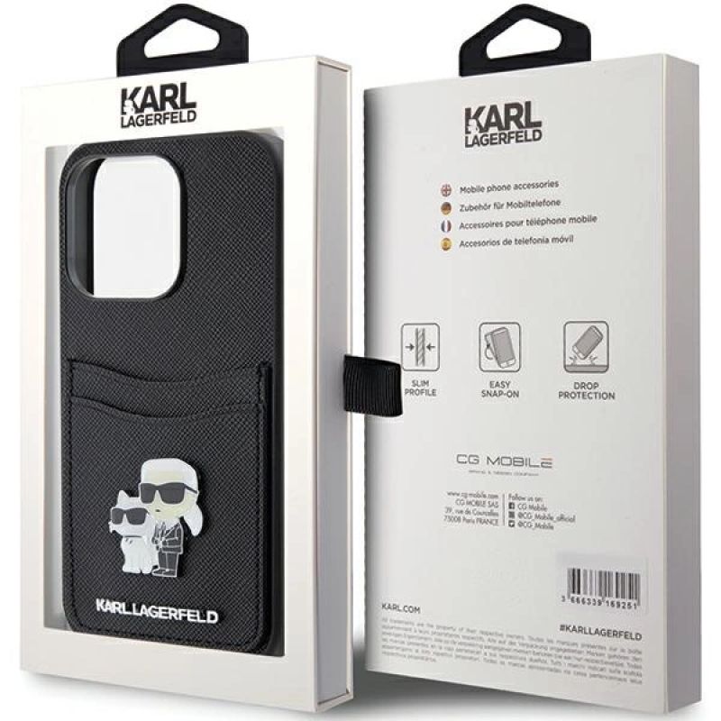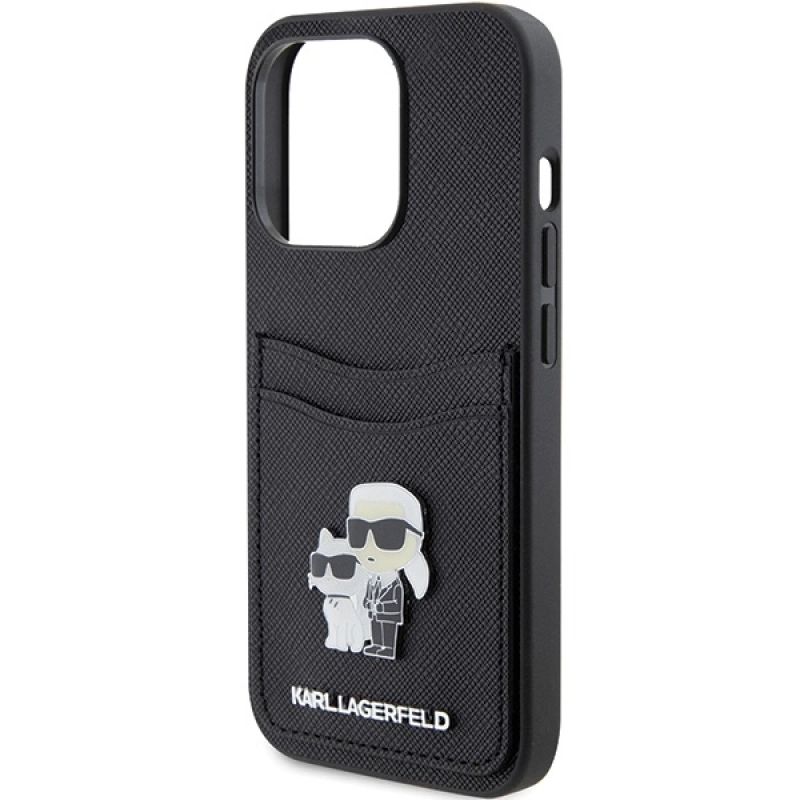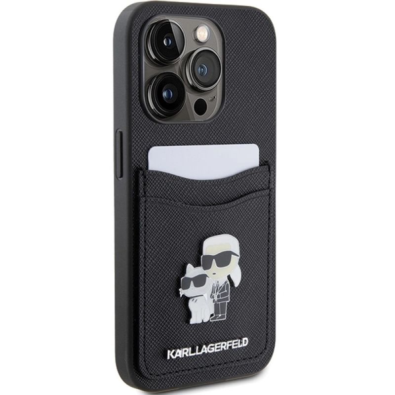 Karl Lagerfeld Saffiano Cardslot Karl&Choupette Metal Pin Hülle für iPhone 15 Pro – Schwarz