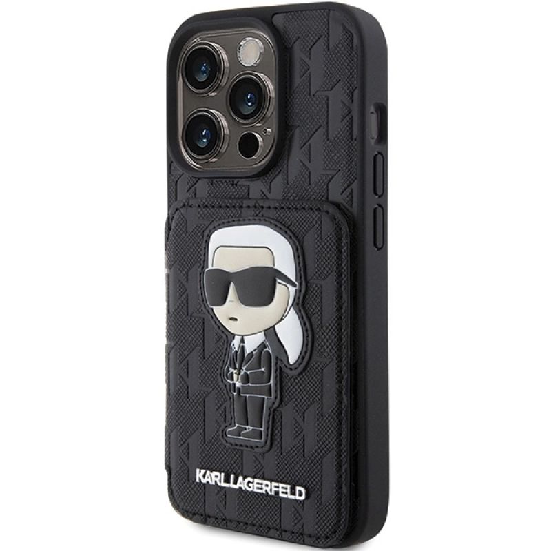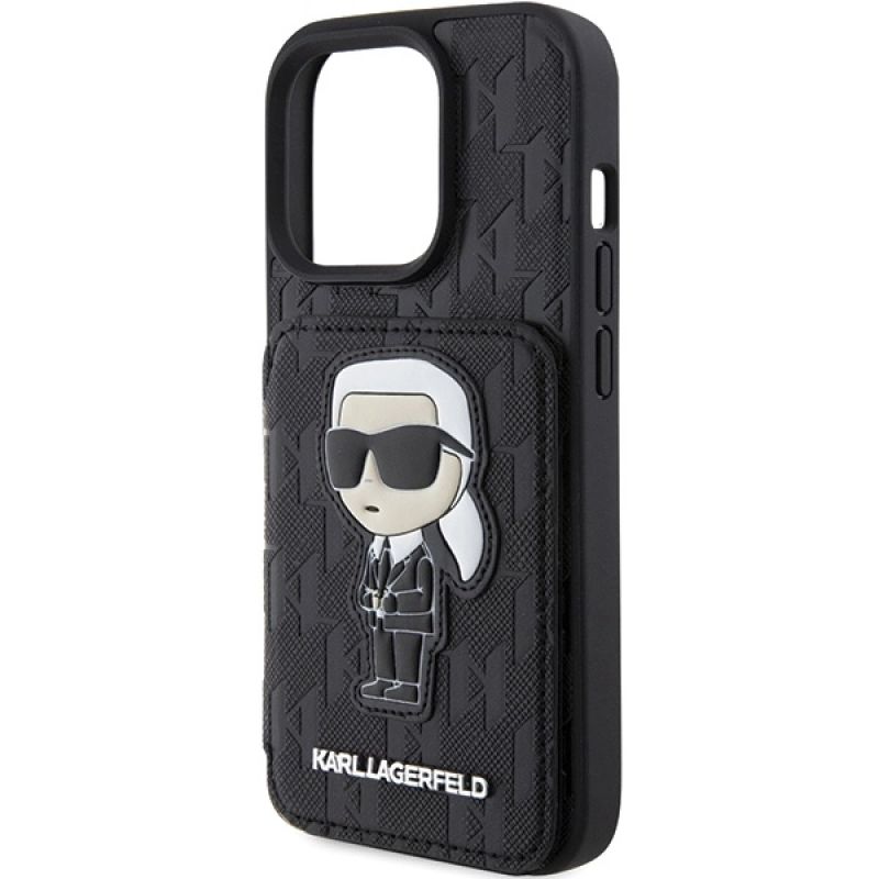 Karl Lagerfeld Saffiano Cardslots and Stand Monogram Ikonik Patch Hülle für iPhone 15 Pro – Schwarz