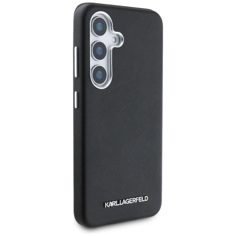 Karl Lagerfeld Saffiano Vollumwickelte MagSafe Hülle mit länglichem Metalllogo für Samsung Galaxy S25+ - Schwarz