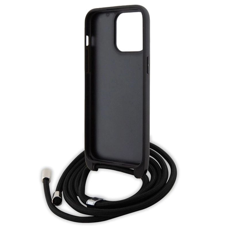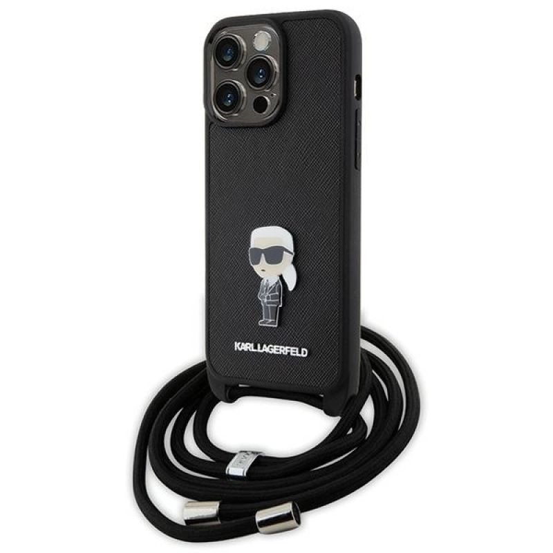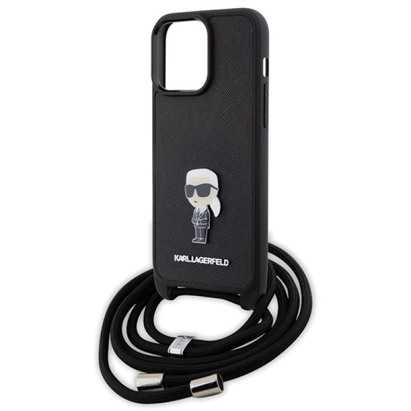 Karl Lagerfeld Umhängetasche mit Saffiano-Monogramm und Metallnadel, Karl & Choupette-Hülle für iPhone 15 Pro Max – Schwarz