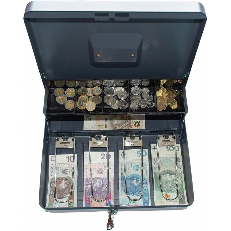 Dank des Fünf-Fächer-Einsatzes ermöglicht die Geldkassette eine übersichtliche Aufbewahrung von Banknoten und Münzen und ist somit ideal für Geschäfte, Büros und Privathaushalte geeignet. Der Einsatz besteht aus robustem ABS-Kunststoff und ist daher widerstandsfähig und leicht zu reinigen.