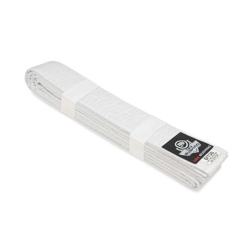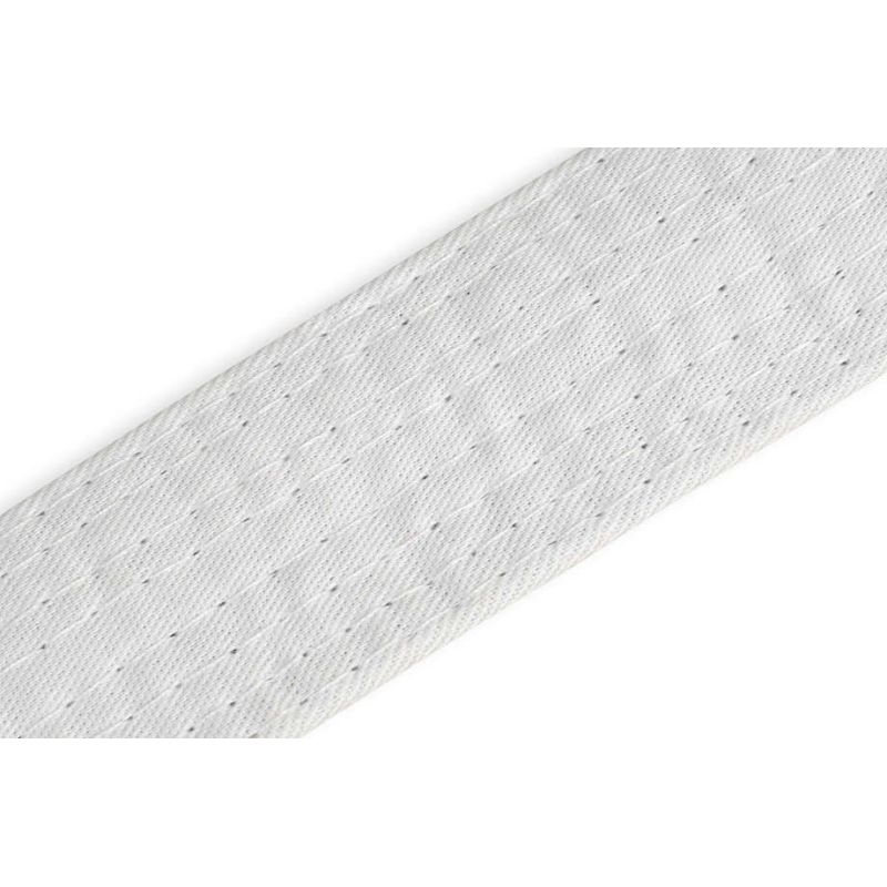Ein weißer Gürtel für Kampfsport-Kimonos aus einer Materialmischung aus Polyester und Baumwolle, die für Abrieb- und Reißfestigkeit sorgt.