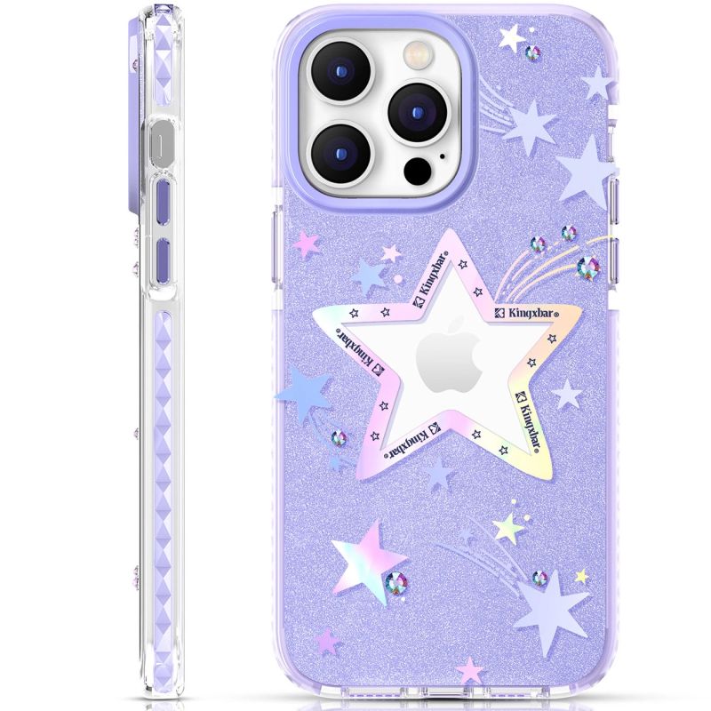 Glitzernde iPhone 14 Plus-Hülle, verziert mit Kristallen aus der Kingxbar Heart Star-Serie in lila Sternfarbe