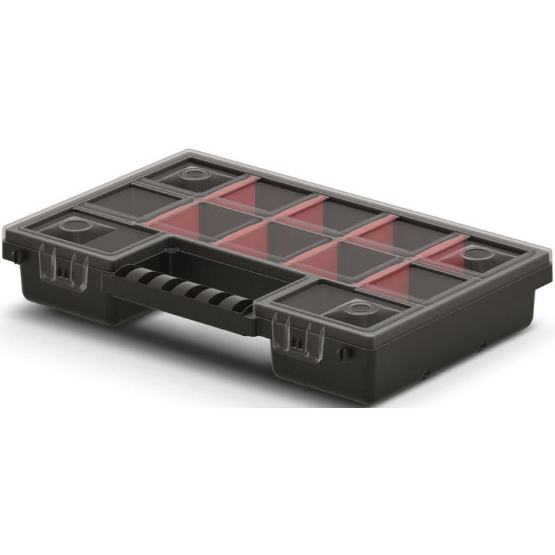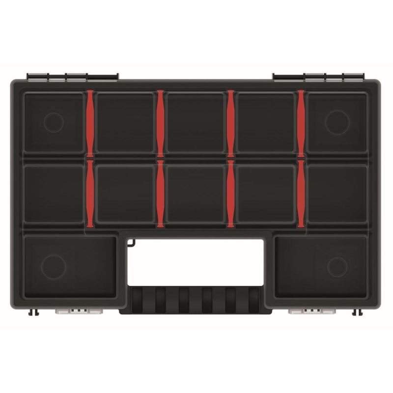 Der Organizer verfügt über 16 verschiebbare Fächer, wodurch Sie Größe und Anzahl der Fächer an Art und Größe der aufbewahrten Werkzeuge anpassen können. Dank des praktischen transparenten Deckels können Sie die Gegenstände sehen, ohne den Deckel öffnen zu müssen.